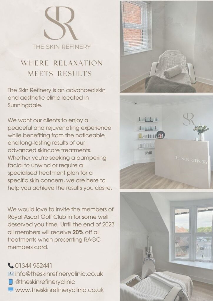 We are delighted to let members know that we have a new preferred partner. The Skin Refinery based on Sunningdale High Street opens tomorrow (Saturday 9th September) for their launch day from 12noon – 5pm. We recommend that you go down and take a look at their easy to access location and gorgeous treatment rooms.